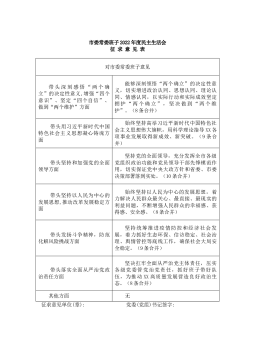 市委常委班子2022年度民主生活会征求意见表对市委常委班子意见带头深刻感悟“两个确立”的决定性意义,增强“四个意识”、坚定“四个自信”、做到“两个维护”方面能够深刻领悟“两个确立”的决定性意义,切实增进政治认同、思想认同、理论认同、情感认同,以实际行动和实际成效坚定拥护“两个确立”,坚决做到“两个维护”。(8条合并)带头用习近平新时代中国特色社会主义思想凝心铸魂方面始终坚持高举习近平新时代中国特色社会主义思想伟大旗帜,用科学理论指导XX各项事业发展取得新成效、新突破。(9条合并)带头坚持和加强党的全面领导方面坚持党的全面领导,充分发挥全市各级党组织政治功能和党员领导干部先锋模范作用,切实保证党...
