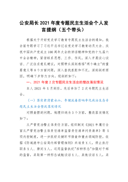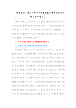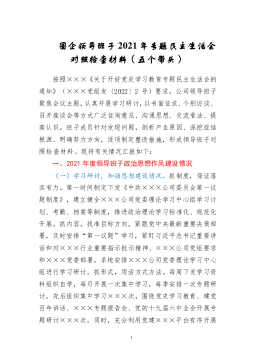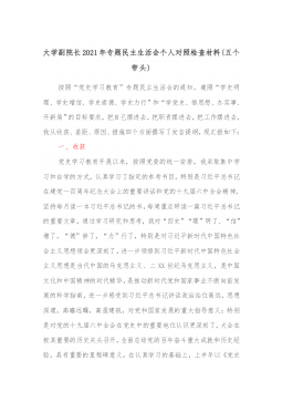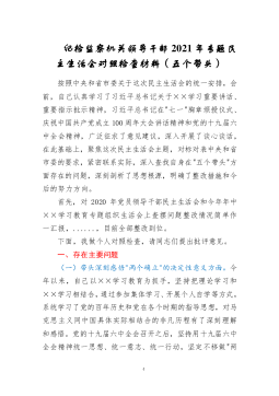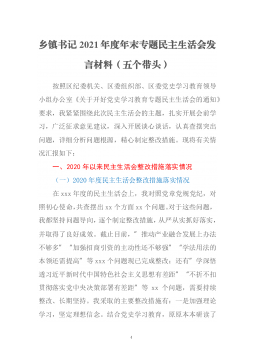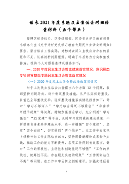 党员领导干部2021年度专题民主生活会个人对照检查材料(五个带头)按照此次党史学习教育专题民主生活会的方案部署和通知要求,本人聚焦"大力弘扬伟大建党精神,坚持和发展党的百年奋斗历史经验,坚定历史自信,践行时代使命,厚植为民情怀,勇于担当作为,团结带领人民群众走好新的赶考之路"这个主题,坚持把自己摆进去、把职责摆进去、把工作摆进去,在认真学习的基础上,严格对照"五个带头",深入开展谈心谈话,广泛征求意见建议,认真查摆问题,深刻对照剖析,明确了今后努力方向和改进措施。现对照检查如下:一、2020年度民主生活会个人整改措施落实情况2020年度民主生活会召开后,本人认真贯彻"守初心、担使命、找差距、抓...