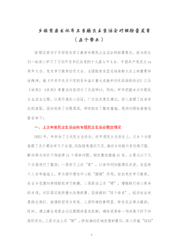 乡镇党委领导班子2021年专题民主生活会对照检查材料(2篇)乡镇党委领导班子2021年专题民主生活会对照检查材料1按照xx市纪委、市委组织部关于召开以巡视整改为主题的民主生活会统一部署和要求,xx镇召开2021年度民主生活会,会前重温了习近平新时代中国特色社会主义思想和党的十九大报告,认真学习了总书记视察xx、视察xx重要讲话精神及对xx工作的一系列重要指示批示精神,进一步深入学习了省、xx市委、xx市委关于中央巡视反馈意见整改落实工作的部署要求。按照本次民主生活会的主题,对照上级巡视反馈意见及整改落实工作要求,严肃开展谈心谈话xx余次,广泛征求意见建议xx条,认真查摆问题,深刻查找班子存在的...