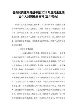 县自然资源局党组书记2025年度民主生活会个人对照检查材料(五个带头)根据本次民主生活会主题要求,本人紧扣深入学习贯彻习近平新时代中国特色社会主义思想这一主线,全面学习领会党的二十届三中、四中全会精神,深入贯彻学习教育要求,认真对照五个方面重点内容,紧密联系个人思想、学习和工作实际,深入查摆突出问题,深刻剖析思想根源,明确整改方向和措施。现将个人对照检查情况报告如下。一、存在的主要问题(一)在带头强化政治忠诚、提高政治能力方面。一是理论武装向实践转化的穿透力尚有不足。虽然能够坚持参加理论学习中心组学习,第一时间学习党的创新理论和重要会议精神,但在运用其立场观点方法指导自然资源工作实践、破解复杂难题上,融合深度不够。例如,在组织编制《**县国土空间生态修复规划》及推动2025年度实施过程中,更...