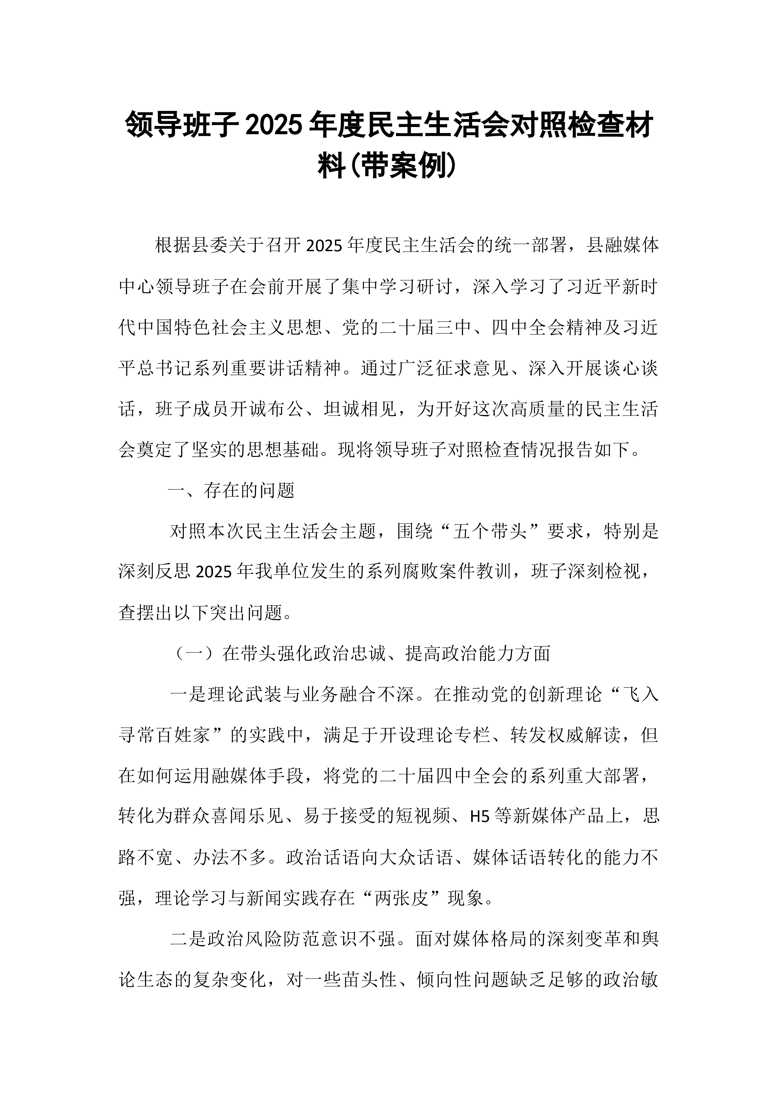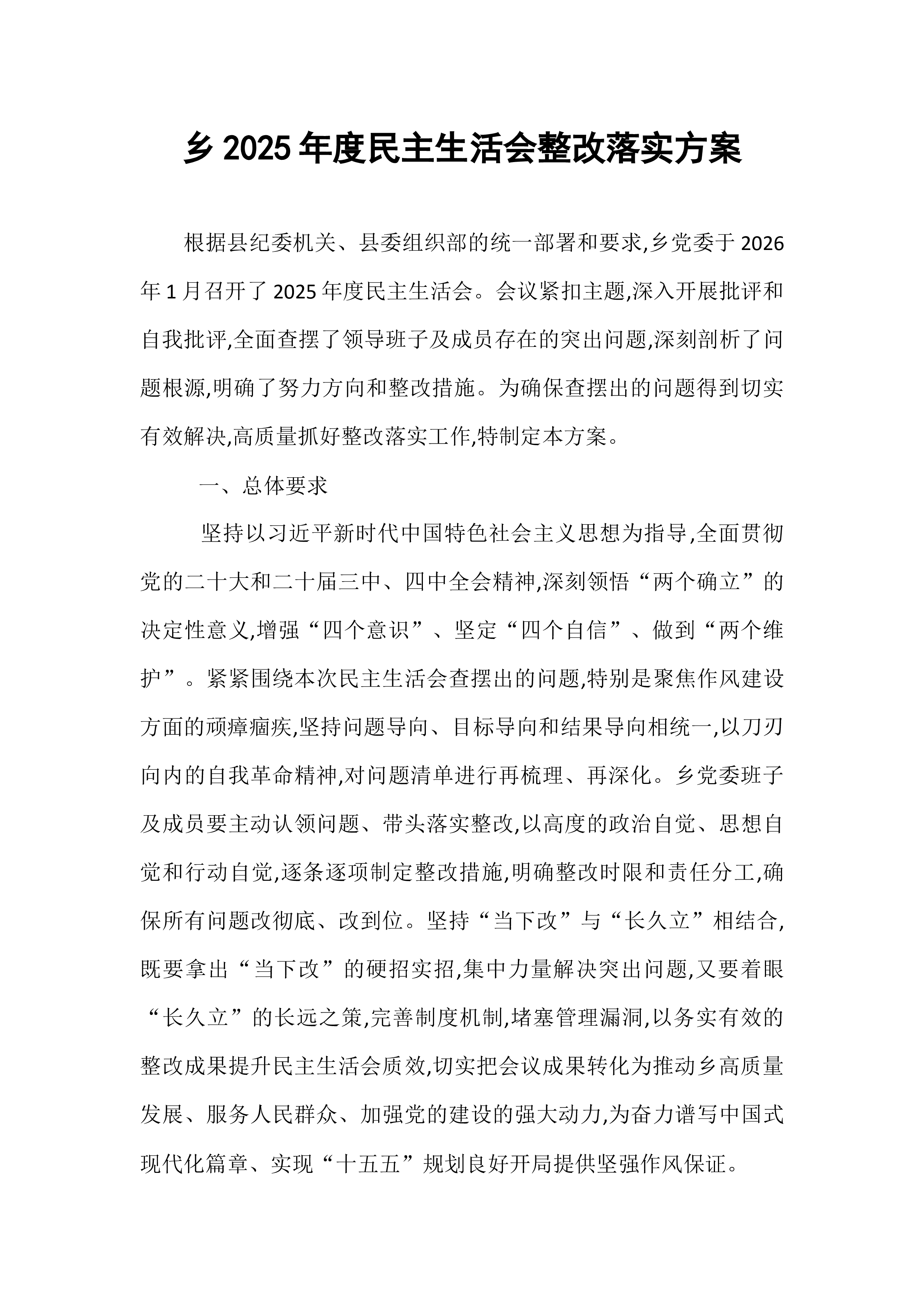 乡2025年度民主生活会整改落实方案根据县纪委机关、县委组织部的统一部署和要求,乡党委于2026年1月召开了2025年度民主生活会。会议紧扣主题,深入开展批评和自我批评,全面查摆了领导班子及成员存在的突出问题,深刻剖析了问题根源,明确了努力方向和整改措施。为确保查摆出的问题得到切实有效解决,高质量抓好整改落实工作,特制定本方案。一、总体要求坚持以习近平新时代中国特色社会主义思想为指导,全面贯彻党的二十大和二十届三中、四中全会精神,深刻领悟“两个确立”的决定性意义,增强“四个意识”、坚定“四个自信”、做到“两个维护”。紧紧围绕本次民主生活会查摆出的问题,特别是聚焦作风建设方面的顽瘴痼疾,坚持问题导向、目标导向和结果导向相统一,以刀刃向内的自我革命精神,对问题清单进行再梳理、再深化。乡党委班子及...