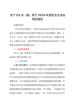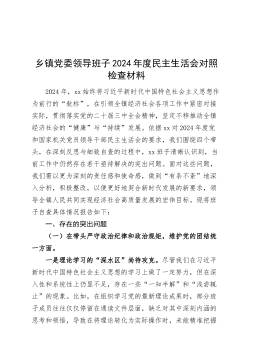 乡镇党委领导班子2024年度民主生活会对照检查材料2024年,xx始终将习近平新时代中国特色社会主义思想作为前行的“航标”,在引领全镇经济社会各项工作中紧密对接实际,贯彻落实党的二十届三中全会精神,坚定不移推动全镇经济社会的“健康”与“持续”发展。依据xx对2024年度党和国家机关党员领导干部民主生活会的要求,我们围绕四个带头,在深刻反思与细致自查的过程中,xx班子清晰认识到,当前工作中仍然存在若干亟待解决的突出问题。面对这些问题,我们需以更为深刻的责任感和使命感,做到“有条不紊”地深入分析,积极整改,以便更好地契合新时代发展的新要求,领导全镇人民共同实现经济社会高质量发展的宏伟目标。现将班子...