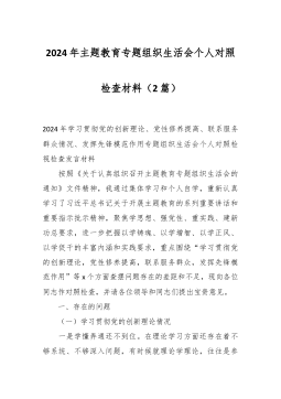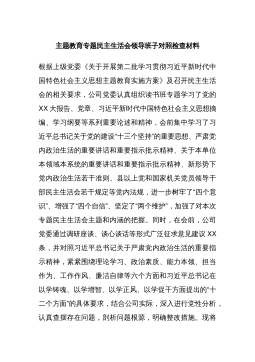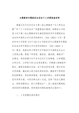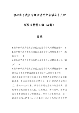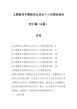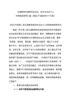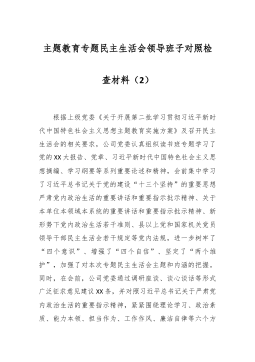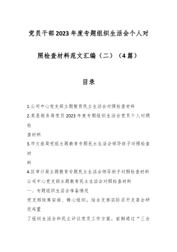 党员干部2023年度专题组织生活会个人对照检查材料范文汇编(二)(4篇)目录1.公司中心党支部主题教育民主生活会对照检查材料2.某县税务局党员2023年度专题组织生活会党员个人对照检查材料3.市文旅局党组主题教育专题民主生活会领导班子对照检查材料4.区审计局主题教育专题民主生活会领导班子对照检查材料公司中心党支部主题教育民主生活会对照检查材料一、专题组织生活会准备情况党支部统筹安排、精心组织,结合支部实际召开支委会研究布置了组织生活会和民主评议党员工作方案。前期通过“三会一课”、主题党日等形式,深入学习领会习近平总书记关于党的建设的重要思想,学习习近平总书记关于严肃党内政治生活的重要论述等相关...