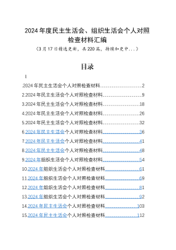 2024年度民主生活会、组织生活会个人对照检查材料汇编(3月17日精选更新,共220篇,持续加更中...)目录1.2024年民主生活会个人对照检查材料........................................22.2024年民主生活会个人对照检查材料......................................93.2024年民主生活会个人对照检查材料...................................184.2024年民主生活会个人对照检查材料...................................265.2024年民主生活...