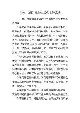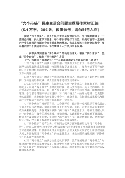 “六个带头”民主生活会问题查摆写作素材汇编(5.4万字,386条,仅供参考,请勿对号入座)围绕“六个带头”,从多个民主生活会发言材料中,分门别类梳理了一下查摆的问题,供大家学习借鉴。每个带头都进行了归类,归类可能不一定精准,六个带头查摆的问题也会有类型重复的情况,大家在写民主生活会过程中,要尽量在前三个类别中去写。本次整理5.4万字,386条问题。一、在带头深刻感悟“两个确立”的决定性意义,增强“四个意识”、坚定“四个自信”、做到“两个维护”方面(一)关键词“思想认识”---主要是思想认识方面的问题(16条)1.对“两个确立”的认识还需加强,对其重大历史意义、丰富政治内涵、深厚实践要求缺乏系统...