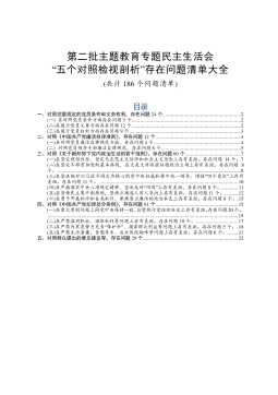 第二批主题教育专题民主生活会“五个对照检视剖析”存在问题清单大全(共计186个问题清单)目录一、对照党章规定的党员条件和义务权利,存在问题24个........................................................2(一)在对照党员条件方面存在问题3个..............................................................................2(二)在履行党员义务方面存在问题12个..........................................................