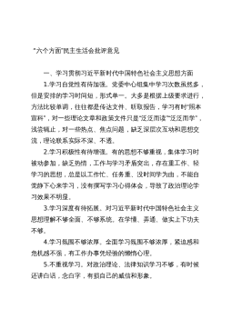 2022年“六个方面”民主生活会批评意见(106条)一、学习贯彻习近平新时代中国特色社会主义思想方面1.学习自觉性有待加强。党委中心组集中学习次数虽然多,但是安排的学习时间短,形式单一。大多是根据上级要求进行,方法比较单调,往往都是传达文件、听取报告,学习有时“照本宣科”,对一些理论文章和政策文件只是“泛泛而读”“泛泛而学”,浅尝辄止,对一些热点、焦点问题,缺乏深层次互动和思想交流,理论联系实际不深、不透。2.学习积极性有待增强。有的思想不够重视,集体学习时被动参加,缺乏热情,工作与学习矛盾突出,存在重工作、轻学习的思想,总是以工作忙、任务重、没时间学为由,不能自觉静下心来学习,没有撰写学习心...