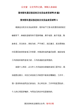 宣传部长意识形态民主生活会发言材料(8篇)宣传部长意识形态民主生活会发言材料1根据这次民主生活会的安排,现作如下汇报:在区委区政府的正确领导下,柿铺街道领导班子思路明确,勇于创新,敢于实践,勤政务实,关注民生,亲民为民,严于律己,清正廉洁,坚决贯彻执行区委区政府的各项工作部署,对推进街道跨越式发展,稳定各项工作的组织领导是有力的,工作的成效也是明显的。就我个人而言,从今年1月开始担任柿铺街道党工委书记,我深感责任重大,对自己承担的工作职责不敢有丝耄懈怠。工作中,我一直得到街道同志们的信任、关心和支持,工作环境是宽松的,个人的心情是舒畅的,与同志们的合作也是愉快的,六个多月来,在区委区政府的领导...