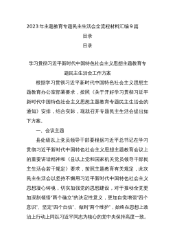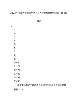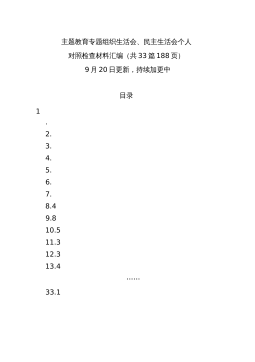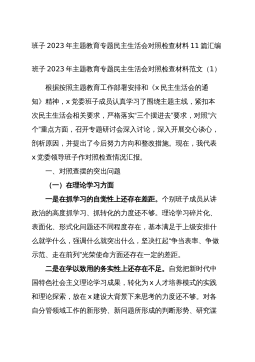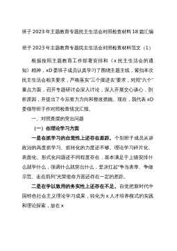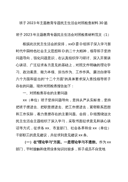 班子2023年主题教育专题民主生活会对照检查材料30篇班子2023年主题教育专题民主生活会对照检查材料范文(1)根据此次民主生活会的安排,xxD委D组班子深入学习新时代中国特色社会主义思想和D的二十大精神,领导班子坚持问题导向,强化问题意识,在认真组织学习研讨、深入开展谈心谈话、广泛征求各方意见的基础上,对照文件明确的理论学习、政治素质、能力本领、担当作为、工作作风、廉洁自律等六个方面和提出的“十二个方面”的具体要求深入查找领导班子存在的问题。现作对照检查报告如下:一、对照检查存在的主要问题xx(单位)班子坚持问题导向,坚持从严从实标准,坚持把班子摆进去、把职责摆进去、把工作摆进去,紧密联系思...