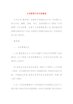 五项管理文件问答解读今年以来,教育部、省教育厅相继出台文件,对加强中小学生手机、睡眠、读物、作业、体质管理(以下简称“五项管理”)作出部署。为便于大家掌握政策口径,现将教育部梳理归纳的28个问答,省教育厅梳理归纳的25个问答转发给大家,供参考。教育部:一、手机管理6问1.问:教育部办公厅《关于加强中小学生手机管理工作的通知》(以下简称《手机管理通知》)对学生将手机带入校园有什么规定?答:学校应当告知学生和家长,原则上不得将个人手机带入校园。学生确有将手机带入校园需求的,须经学生家长同意、书面提出申请,进校后应将手机交由学校统一保管,禁止带入课堂。2.问:《手机管理通知》对学校制定手机管理办法有...