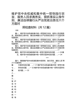 维护党中央权威和集中统一领导践行宗旨、服务人民求真务实、狠抓落实以身作则、廉洁自律履行从严治党政治责任六个方面对照检查材料(共12篇)目录篇一、维护党中央权威和集中统一领导践行宗旨、服务人民求真务实、狠抓落实以身作则、廉洁自律履行从严治党政治责任六个方面对照检查材料.篇二、维护党中央权威和集中统一领导践行宗旨、服务人民求真务实、狠抓落实以身作则、廉洁自律履行从严治党政治责任六个方面对照检查材料.篇三、维护党中央权威和集中统一领导践行宗旨、服务人民求真务实、狠抓落实以身作则、廉洁自律履行从严治党政治责任六个方面对照检查材料.篇四、维护党中央权威和集中统一领导方面存在的问题.一24篇五、维护党中央...