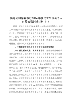 供电公司党委书记2024年度民主生活会个人对照检视剖析材料(1)根据上级关于开好2024年度民主生活会的部署要求,我深入学习领会习近平新时代中国特色社会主义思想,认真研读相关文件,深刻领悟“两个确立”的决定性意义,增强“四个意识”、坚定“四个自信”、做到“两个维护”。紧密结合自身工作实际,深入查摆问题,深刻剖析根源,明确努力方向和改进措施。现将个人对照检查情况汇报如下。一、主题教育专题民主生活会整改措施落实情况(一)强化理论武装,提升政治站位。始终把政治理论学习作为首要任务,深入学习习近平新时代中国特色社会主义思想和党的二十届三中全会精神,积极参加各类集中学习、专题研讨和个人自学,不断提升政治...