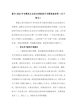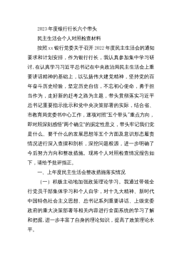 2023年度银行行长六个带头民主生活会个人对照检查材料按照xx银行党委关于召开2022年度民主生活会的通知要求和计划安排,作为银行行长,我认真参加集中学习研讨,在认真学习习近平总书记在中央政治局民主生活会上重要讲话精神的基础上,以弘扬伟大建党精神,坚持党的百年奋斗历史经验,坚定历史自信,不忘初心使命,勇于担当作为,走好新的赶考之路为主题,带头贯彻落实习近平总书记重要指示批示和党中央决策部署的实际,结合省、市教育局党委书中心工作,逐项对照”五个带头"重点方向,即对照深刻感悟”两个确立”的据定性意义,带头牢记我们党是什么、要干什么的发展思想等五个方面及意识形态履责情况进行深入查摆和剖析,深挖问题根...