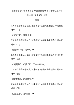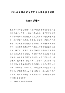 班子2023年主题教育专题民主生活会对照检查材料39篇班子2023年主题教育专题民主生活会对照检查材料范文(1)根据此次民主生活会的安排,xx党委党组班子深入学习习近平新时代中国特色社会主义思想和党的二十大精神,领导班子坚持问题导向,强化问题意识,在认真组织学习研讨、深入开展谈心谈话、广泛征求各方意见的基础上,对照文件明确的理论学习、政治素质、能力本领、担当作为、工作作风、廉洁自律等六个方面和习近平总书记提出的“十二个方面”的具体要求深入查找领导班子存在的问题。现作对照检查报告如下:一、对照检查存在的主要问题xx(单位)班子坚持问题导向,坚持从严从实标准,坚持把班子摆进去、把职责摆进去、把工作...