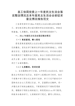 ·1县工信局党委上一年度民主生活会落实整改情况及本年度民主生活会会前征求意见情况报告范文工信委党委针对20xx年度民主生活会提出的加强学习、密切联系群众等方面问题和所征求到的意见,积极采取措施,认真整改,成效显著。现将情况通报如下:一、20xx年度民主生活会落实整改情况(一)高度重视,精心谋划委党委高度重视民主生活会提出问题和所征求到的意见的整改,首先在学习教育边学边查边改的基础上,采取座谈访谈、设置意见箱和网络征询等方式,针对相关意见和问题进行了梳理和分门别类,结合工信委实际和各班子成员主管、分管工作的情况,制定整改方案,责任到人,进行了全面的整改。(二)认真整改,促进发展1、在加强理论学习...