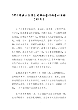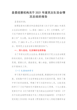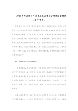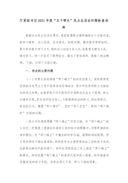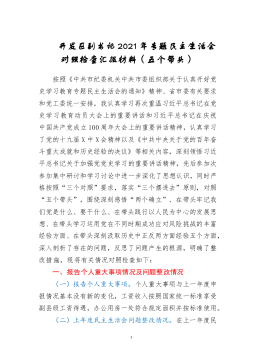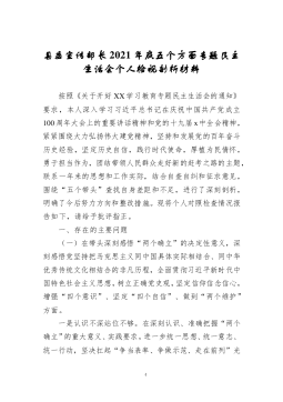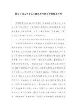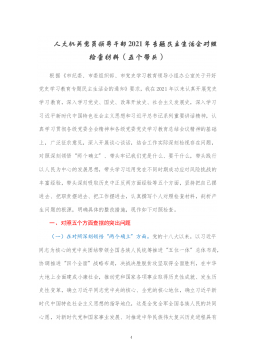 ·1人大机关党员领导干部2021年专题民主生活会对照检查材料(五个带头)根据《市纪委、市委组织部、市党史学习教育领导小组办公室关于开好党史学习教育专题民主生活会的通知》要求,我在2021年以来认真开展党史学习教育,深入学习党史、国史、改革开放史、社会主义发展史,深入学习习近平新时代中国特色社会主义思想和习近平总书记系列重要讲话精神,认真学习贯彻各级党委全会精神和各级党委党史学习教育总结会议精神的基础上,广泛征求意见,深入开展谈心谈话,结合工作实际深刻检视存在问题,对照深刻领悟“两个确立”、带头牢记我们党是什么、要干什么,带头践行以人民为中心的发展思想,带头学习运用党在不同时期成功应对风险挑战的...