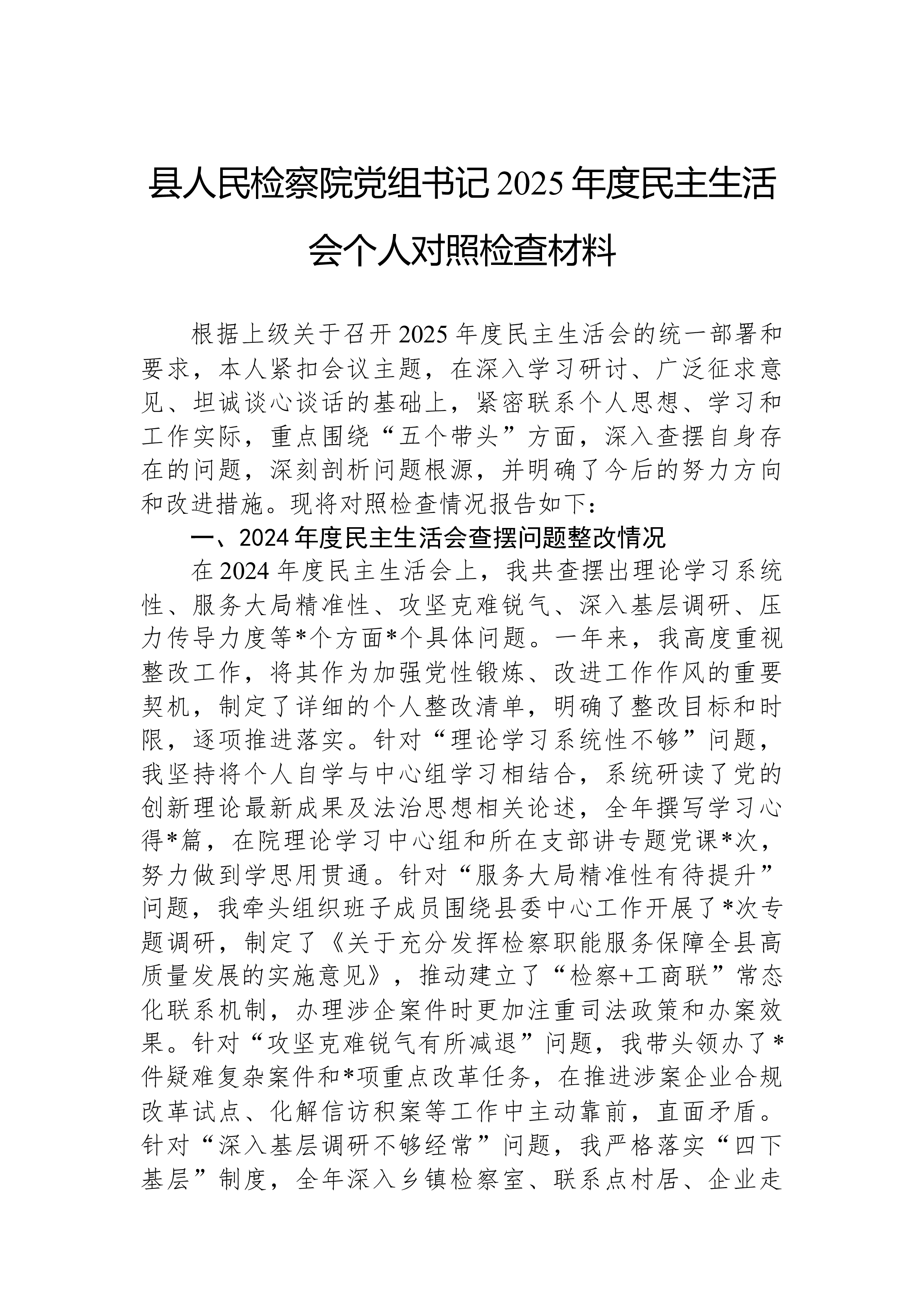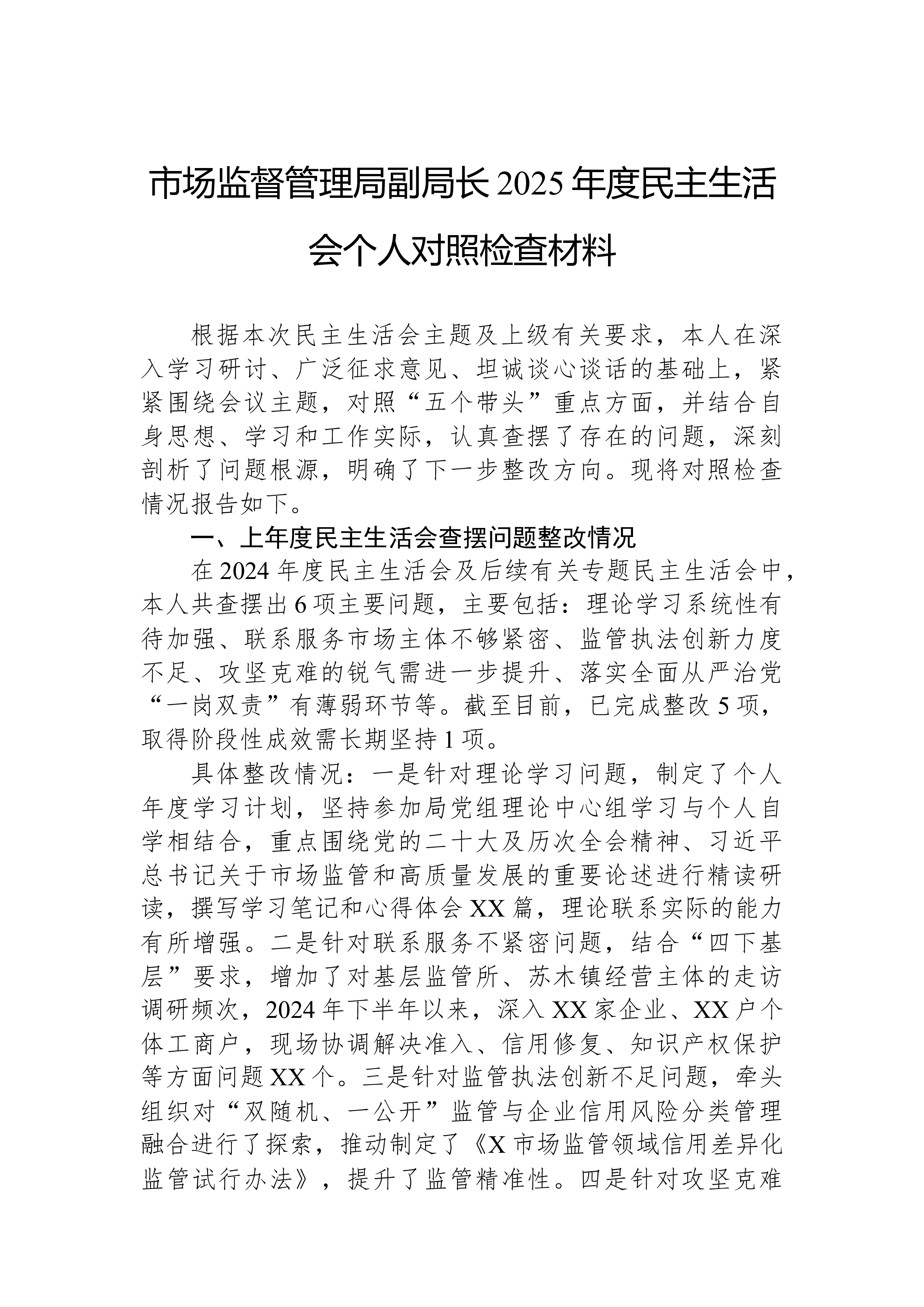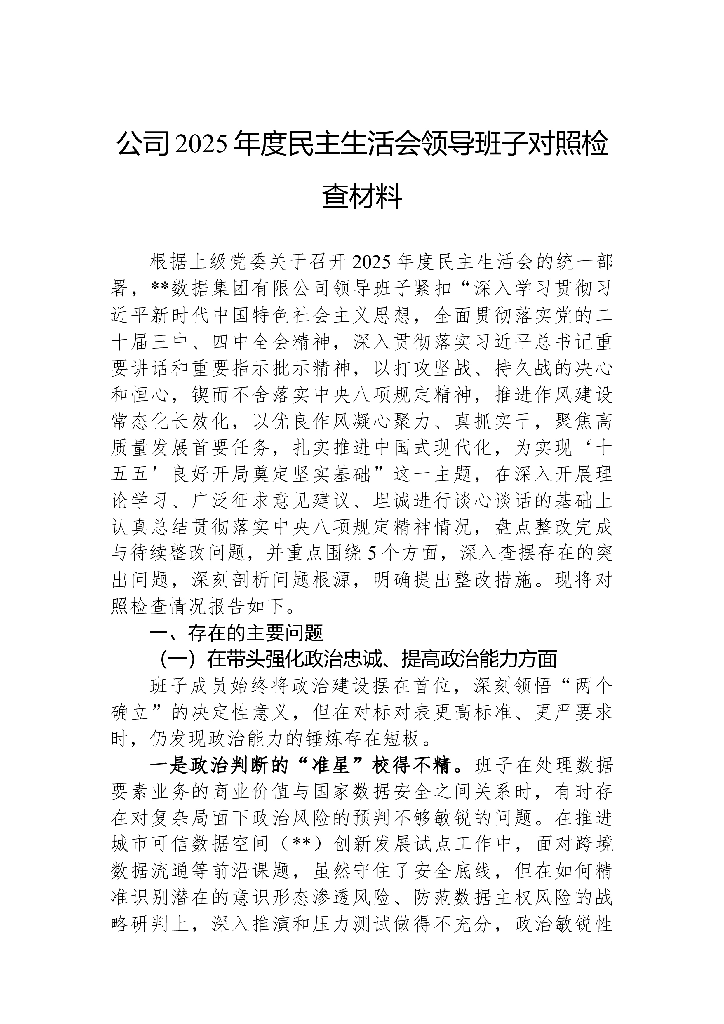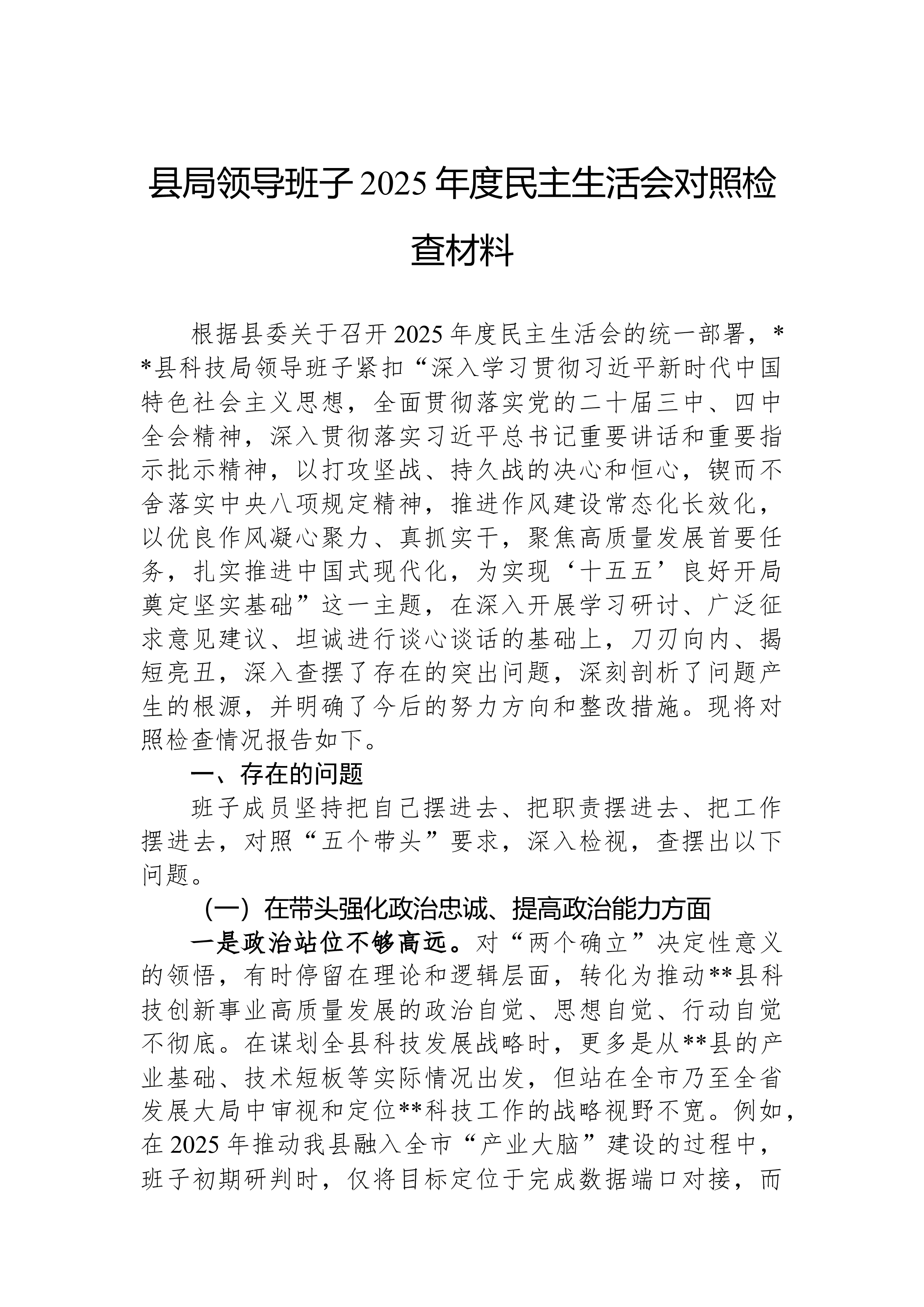 XX县科技局领导班子2025年度民主生活会对照检查材料根据县委关于召开2025年度民主生活会的统一部署,XX县科技局领导班子紧扣“深入学习贯彻习近平新时代中国特色社会主义思想,全面贯彻落实党的二十届三中、四中全会精神,深入贯彻落实习近平总书记重要讲话和重要指示批示精神,以打攻坚战、持久战的决心和恒心,锲而不舍落实中央八项规定精神,推进作风建设常态化长效化,以优良作风凝心聚力、真抓实干,聚焦高质量发展首要任务,扎实推进中国式现代化,为实现‘十五五’良好开局奠定坚实基础”这一主题,在深入开展学习研讨、广泛征求意见建议、坦诚进行谈心谈话的基础上,刀刃向内、揭短亮丑,深入查摆了存在的突出问题,深刻剖析了问题产生的根源,并明确了今后的努力方向和整改措施。现将对照检查情况报告如下。一、存在的问题班子成员...