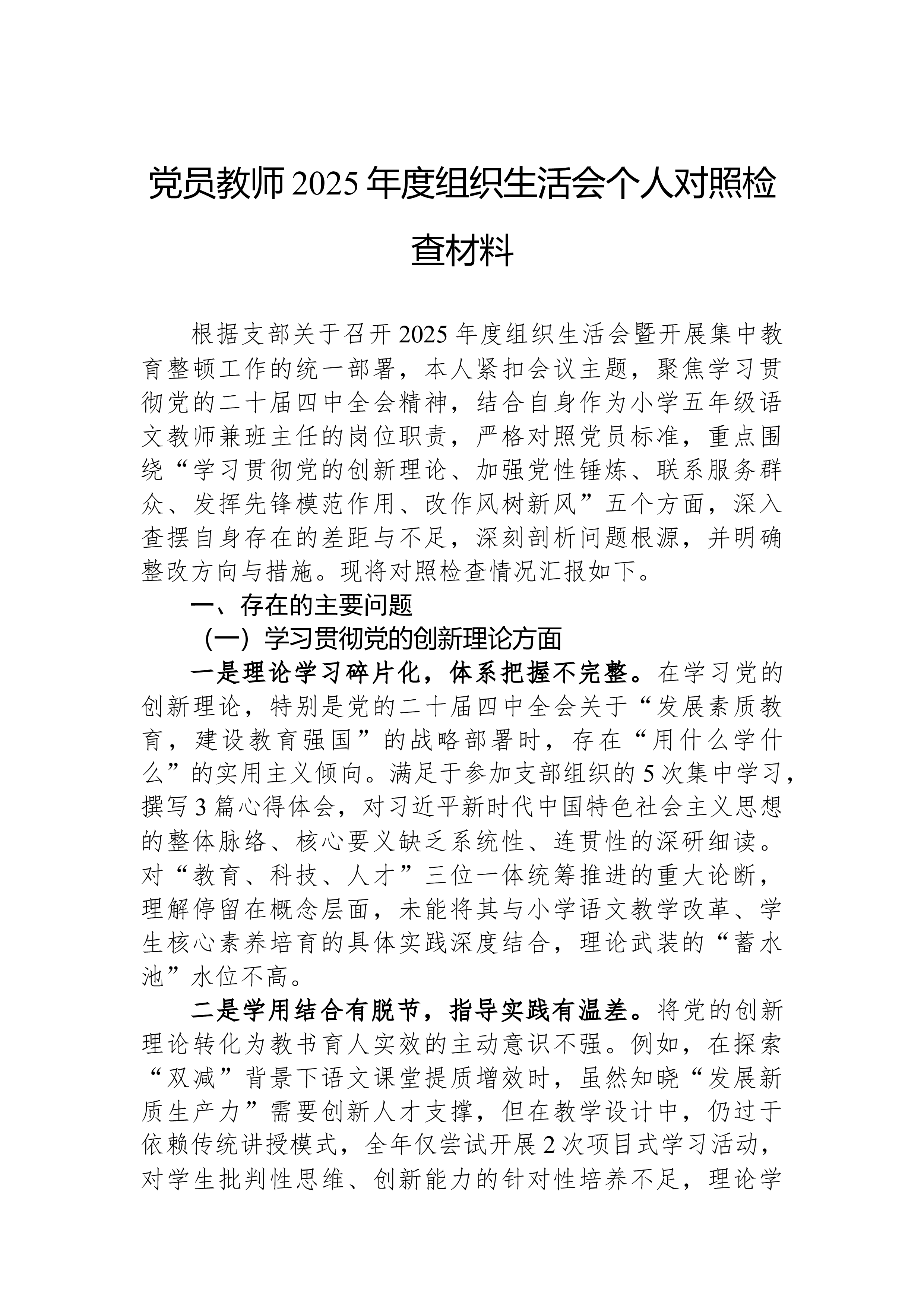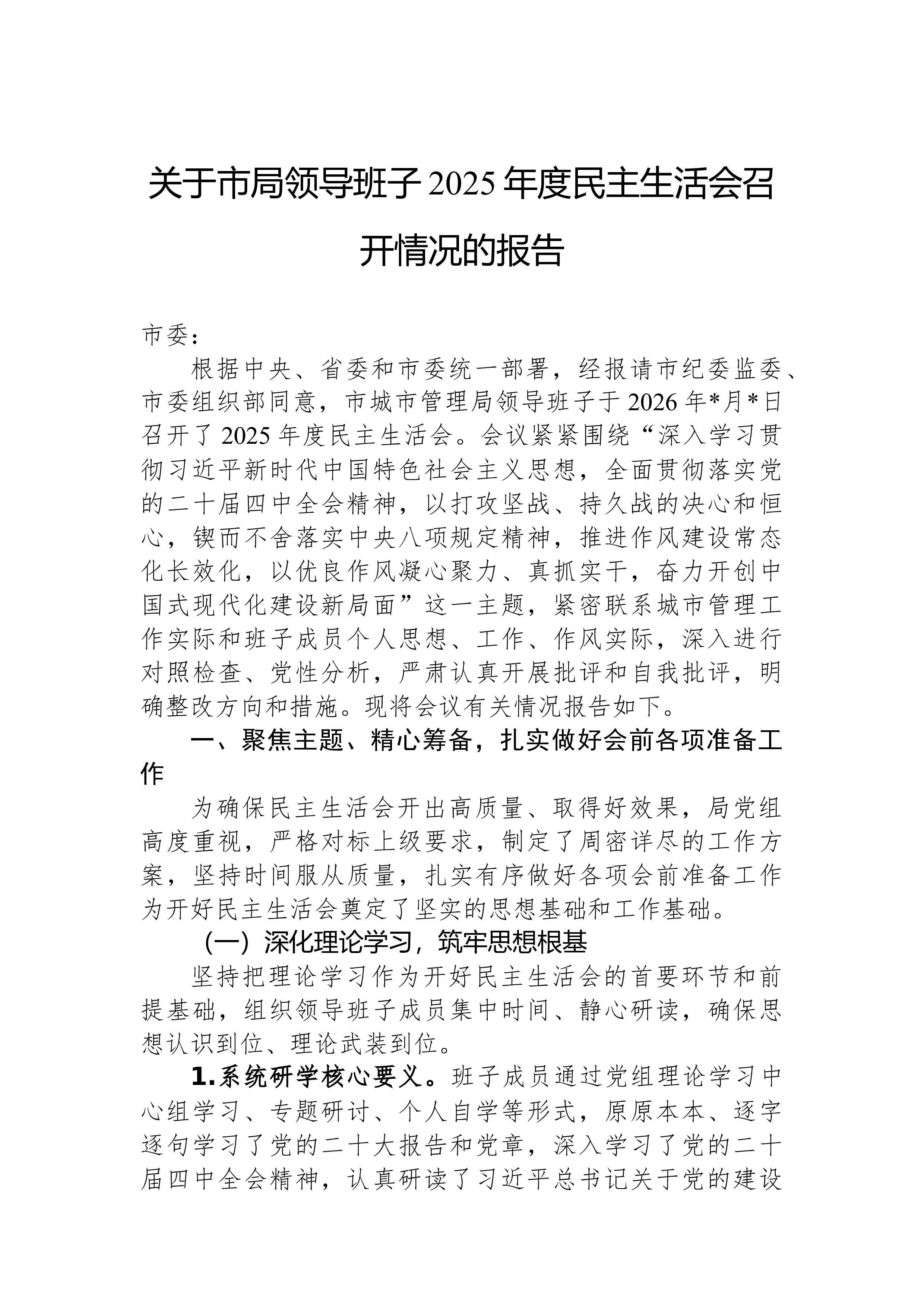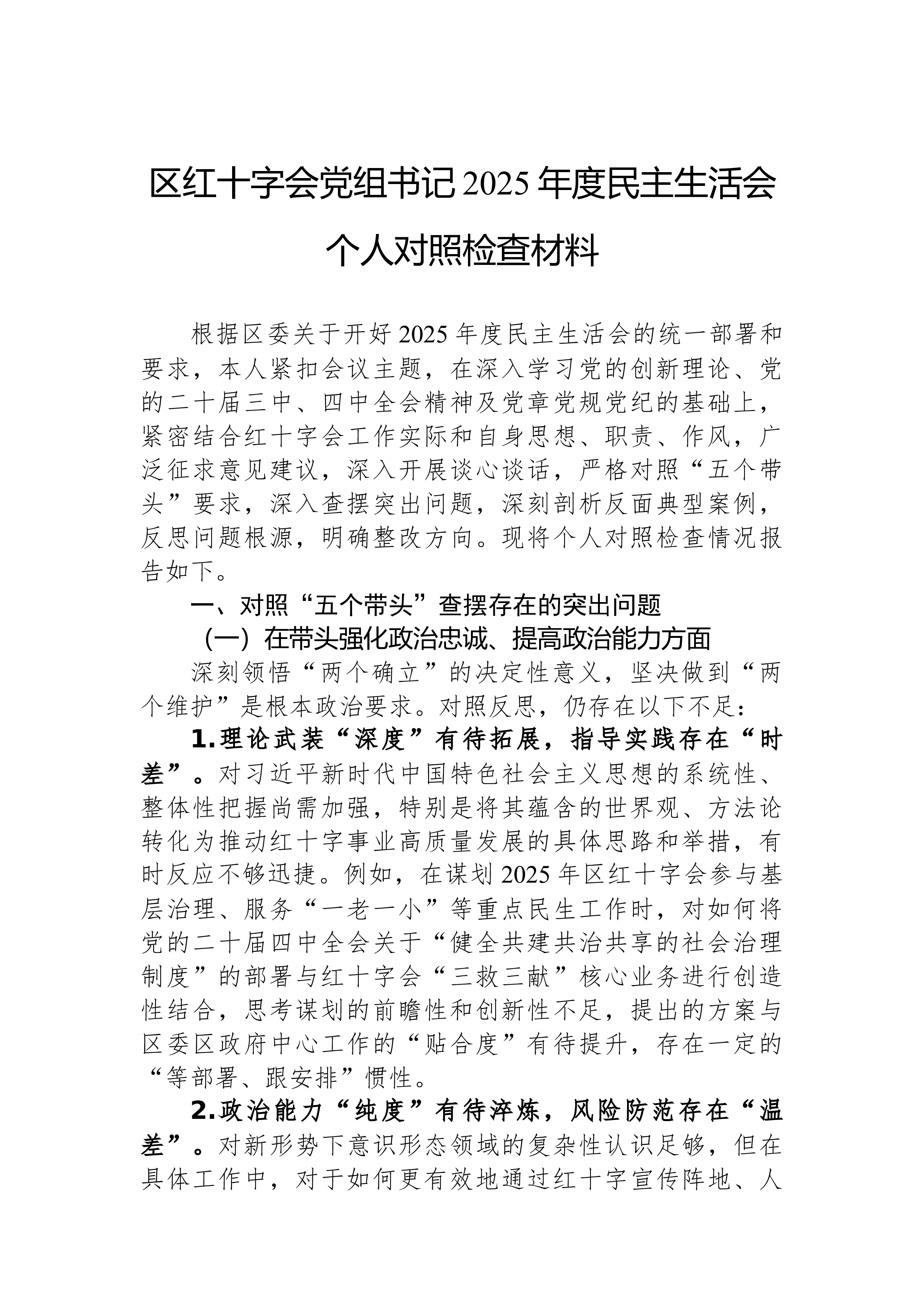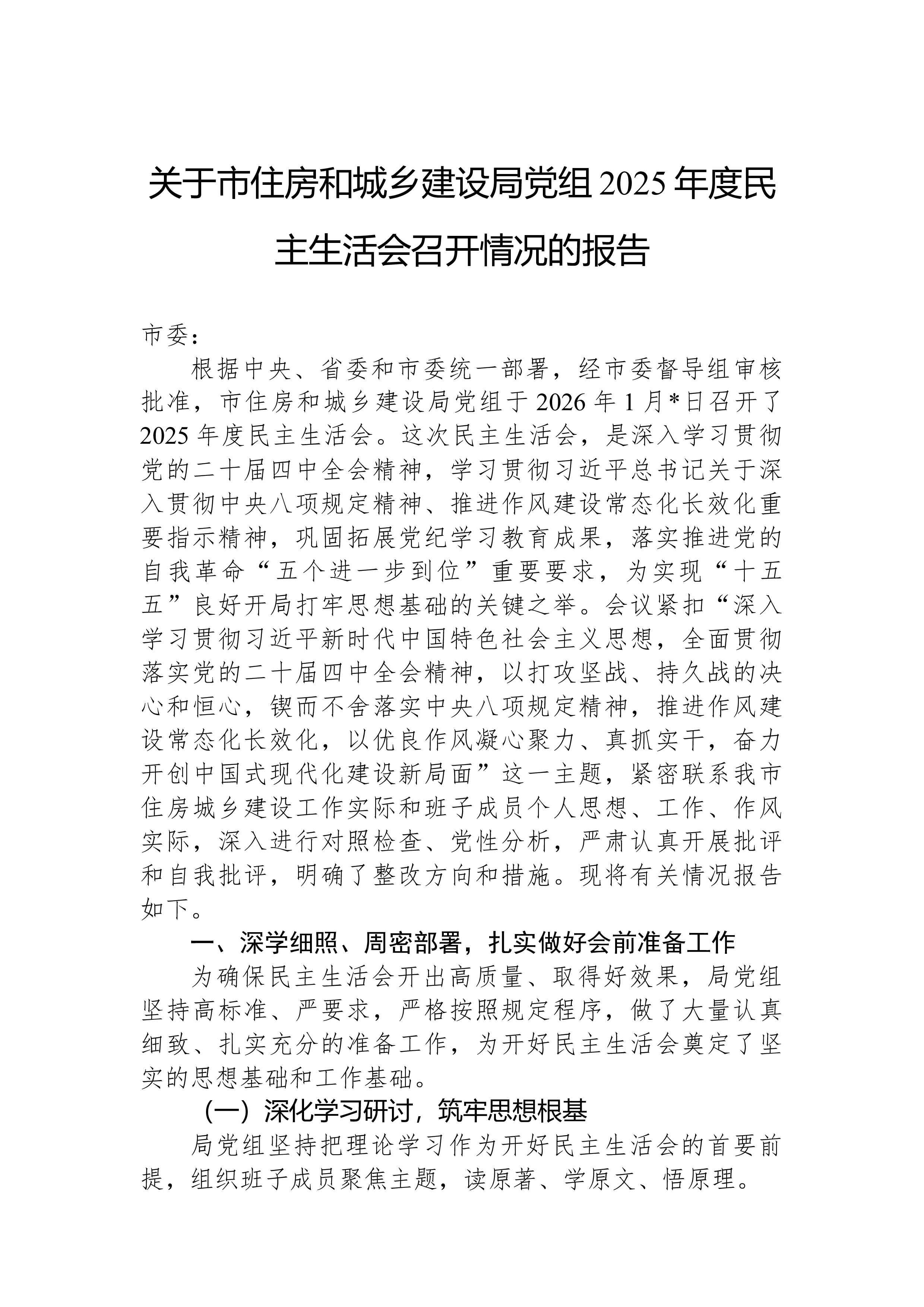 XX县科技局领导班子2025年度民主生活会对照检查材料根据县委关于召开2025年度民主生活会的统一部署,XX县科技局领导班子紧扣“深入学习贯彻习近平新时代中国特色社会主义思想,全面贯彻落实党的二十届三中、四中全会精神,深入贯彻落实习近平总书记重要讲话和重要指示批示精神,以打攻坚战、持久战的决心和恒心,锲而不舍落实中央八项规定精神,推进作风建设常态化长效化,以优良作风凝心聚力、真抓实干,聚焦高质量发展首要任务,扎实推进中国式现代化,为实现‘十五五’良好开局奠定坚实基础”这一主题,在深入开展学习研讨、广泛征求意见建议、坦诚进行谈心谈话的基础上,刀刃向内、揭短亮丑,深入查摆了存在的突出问题,深刻剖析了问题产生的根源,并明确了今后的努力方向和整改措施。现将对照检查情况报告如下。一、存在的问题班子成员...