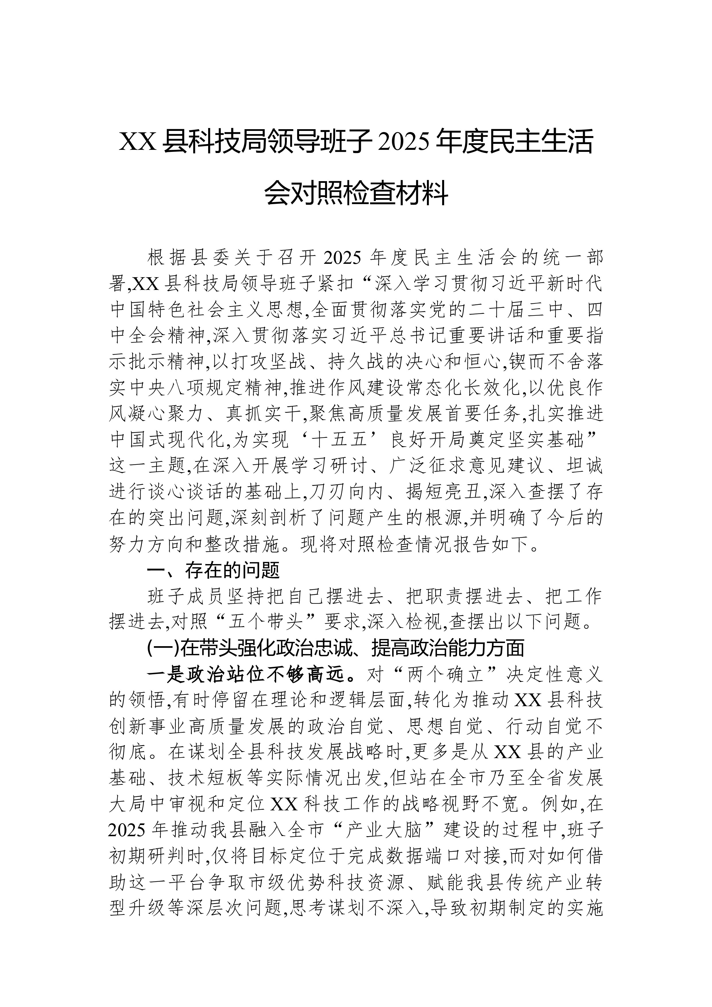 XX县科技局领导班子2025年度民主生活会对照检查材料