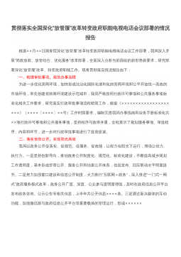 贯彻落实全国深化“放管服”改革转变政府职能电视电话会议部署的情况报告根据××月××日国务院深化“放管服”改革转变政府职能电视电话会议工作部署,我局深入开展“简政放权、放管结合、优化服务”改革部署,全面深入分析当前面临的新形势新要求,研究部署深化“放管服”改革、转变政府职能工作。现将贯彻落实情况报告如下:一、梳理审批事项,规范办事流程为进一步优化营商环境,加快形成法治化国际化便利化的营商环境和公平开放统一高效的市场环境,率先创建省营商环境建设示范城市,我局严格按照行政许可事项和公共服务事项标准化相关工作要求,研究落实行政审批事项流程精简工作,根据《××××××××××××××××××××》(××...