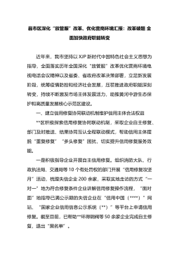 县市区深化“放管服”改革、优化营商环境汇报:改革破题全面加快政府职能转变 近年来,我市坚持以XJP新时代中国特色社会主义思想为指导,全面落实历年全国深化“放管服”改革优化营商环境电视电话会议精神以及省委、省政府改革决策部署,立足新发展阶段,统筹疫情防控和经济社会发展,压茬推进政府职能深刻转变,持续不断激发市场主体发展活力,助推黄河中游生态保护和高质量发展核心示范区建设。一、建立信用修复协同联动机制维护信用主体合法权益**区积极探索信用修复协同联动机制,采取企业自主修复、部门及时推送、结果协同互认全程联动模式,帮助信用主体摆脱“重复修复”“多头修复”困扰,切实提升信用修复服务效能。一是积极指导企...