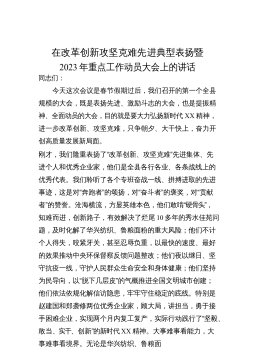 在改革创新攻坚克难先进典型表扬暨2023年重点工作动员大会上的讲话同志们:今天这次会议是春节假期过后,我们召开的第一个全县规模的大会,既是表扬先进、激励斗志的大会,也是提振精神、全面动员的大会,目的就是要大力弘扬新时代XX精神,进一步改革创新、攻坚克难,只争朝夕、大干快上,奋力开创高质量发展新局面。刚才,我们隆重表扬了“改革创新、攻坚克难”先进集体、先进个人和优秀企业家,他们是全县各行各业、各条战线上的优秀代表。我们聆听了各个专班奋战一线、拼搏进取的先进事迹,这是对“奔跑者”的颂扬,对“奋斗者”的褒奖,对“贡献者”的赞誉。沧海横流,方显英雄本色,他们敢啃“硬骨头”,知难而进,创新路子,有效解决...
