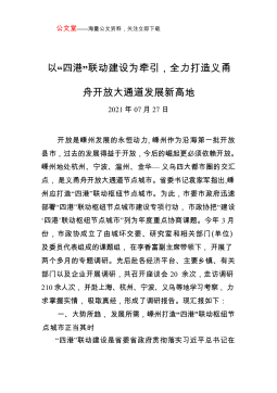 公文堂——海量公文资料,关注立即下载以“四港”联动建设为牵引,全力打造义甬舟开放大通道发展新高地2021年07月27日开放是嵊州发展的永恒动力,嵊州作为沿海第一批开放县市,过去的发展得益于开放,今后的崛起更必须依赖开放。嵊州地处杭州、宁波、温州、金华—义乌四大都市圈的交汇点,是义甬舟开放大通道节点城市。省委书记袁家军指出,嵊州应打造“四港”联动枢纽节点城市。为此,市委市政府迅速部署“四港”联动枢纽节点城市建设专项行动,市政协把“建设‘四港’联动枢纽节点城市”列为年度重点协商课题。今年3月份,市政协成立了由城环交委、研究室和相关部门(单位)及委员代表组成的课题组,在李香富副主席带领下,开展了两个...