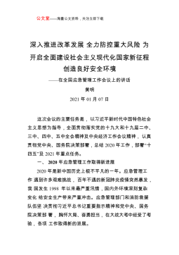公文堂——海量公文资料,关注立即下载深入推进改革发展全力防控重大风险为开启全面建设社会主义现代化国家新征程创造良好安全环境——在全国应急管理工作会议上的讲话黄明2021年01月07日这次会议的主要任务是,以习近平新时代中国特色社会主义思想为指导,全面贯彻落实党的十九大和十九届二中、三中、四中、五中全会精神及中央经济工作会议精神,认真贯彻党中央、国务院决策部署,总结2020年工作,部署“十四五”及2021年重点任务。一、2020年应急管理工作取得新进展2020年是新中国历史上极不平凡的一年。应急管理工作遇到许多艰难挑战,百年不遇的新冠肺炎疫情突然暴发,我国发生1998年以来最严重汛情,国内外环境...