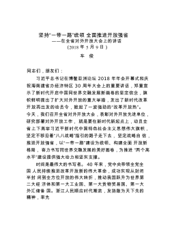 ——车俊在全省对外开放大会上的讲话(2018年5月9日)同志们,朋友们:习近平总书记在博鳌亚洲论坛2018年年会开幕式和庆祝海南建省办经济特区30周年大会上的重要讲话,郑重宣示了新时代开启中国同世界交融发展新画卷的坚定信念,旗帜鲜明提出了扩大对外开放的重大举措,发出了新时代改革开放再出发的动员令,掀起了一波强劲的“改革开放热”。今天,我们召开全省对外开放大会,表彰对外开放先进单位,研究部署对外开放工作,就是要在新时代新起点上,动员全省上下高举习近平新时代中国特色社会主义思想伟大旗帜,坚定不移沿着“八八战略”指引的路子走下去,坚定战略自信,推进开放强省,以“一带一路”建设为统领、构建全面开放新格...