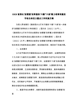 XXX省深化“放管服”改革服务“六稳”“六保”着力培育和激发市场主体活力重点工作实施方案为深入贯彻落实《国务院办公厅关于服务“六稳”“六保”进一步做好“放管服”改革有关工作的意见》(国办发〔2021〕10号)、《国务院办公厅关于印发全国深化“放管服”改革着力培育和激发市场主体活力电视电话会议重点任务分工方案的通知》(国办发〔2021〕25号)精神及全省深化“放管服”改革着力培育和激发市场主体活力电视电话会议要求,结合我省实际,制定如下实施方案。一、总体要求以习近平新时代中国特色社会主义思想为指导,全面贯彻党的十九大和十九届历次全会精神,深入贯彻落实习近平总书记关于深化“放管服”改革和扎实做好“...