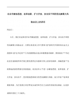 在全市解放思想、改革创新、扩大开放、担当实干和防范化解重大风险会议上的讲话同志们:今天,我们在这里召开全市解放思想、改革创新、扩大开放、担当实干和防范化解重大风险会议,主要任务是深入学习贯彻XJP新时代中国特色社会主义思想和XJP总书记对**工作的重要指示批示和重要题词精神,贯彻落实***书记在全区省级领导和厅级主要负责同志专题研讨班上的讲话精神,准确把握**当前面临的新形势新任务新挑战,动员全市上下进一步解放思想、改革创新、扩大开放、担当实干,坚持底线思维着力防范化解重大风险,奋力开创**改革发展新局面,为打造西江经济带龙头城市和万亿工业强市持续夯实基础,以优异成绩向党的二十大献礼。一、深刻...