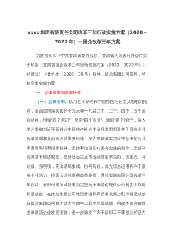 xxxx集团有限责任公司改革三年行动实施方案(2020-2022年)—国企改革三年方案为贯彻落实《中共甘肃省委办公厅、甘肃省人民政府办公厅关于印发〈甘肃省国企改革三年行动实施方案(2020-2022年)〉的通知》(甘办发〔2020〕38号)精神,结合集团公司实际,特制定本实施方案。一、总体要求和首要任务(一)总体要求。以习近平新时代中国特色社会主义思想为指导,全面贯彻落实党的十九大和十九届二中、三中、四中、五中全会精神,增强“四个意识”、坚定“四个自信”、做到“两个维护”,深入学习贯彻习近平新时代中国特色社会主义经济思想及关于国有企业改革发展和党的建设的重要论述,深入贯彻落实习近平总书记对甘肃...