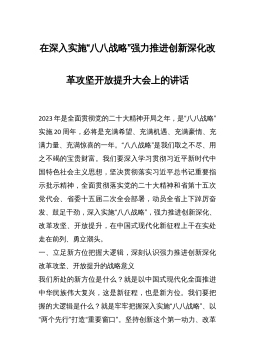 在深入实施“八八战略”强力推进创新深化改革攻坚开放提升大会上的讲话2023年是全面贯彻党的二十大精神开局之年,是“八八战略”实施20周年,必将是充满希望、充满机遇、充满豪情、充满力量、充满惊喜的一年。“八八战略”是我们取之不尽、用之不竭的宝贵财富。我们要深入学习贯彻习近平新时代中国特色社会主义思想,坚决贯彻落实习近平总书记重要指示批示精神,全面贯彻落实党的二十大精神和省第十五次党代会、省委十五届二次全会部署,动员全省上下踔厉奋发、鼓足干劲,深入实施“八八战略”,强力推进创新深化、改革攻坚、开放提升,在中国式现代化新征程上干在实处走在前列、勇立潮头。一、立足新方位把握大逻辑,深刻认识强力推进创新...