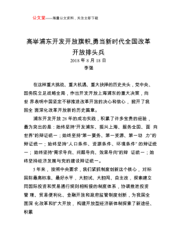 公文堂——海量公文资料,关注立即下载高举浦东开发开放旗帜,勇当新时代全国改革开放排头兵2018年8月18日李强在这样重大挑战、重大机遇、重大抉择的历史关头,党中央、国务院立足战略全局,作出开发开放上海浦东的重大决策,向世界表明中国坚定不移推进改革开放的决心和信心,掀开了我国全面深化改革开放新的历史篇章。浦东开发开放28年的成功实践,积累了许多宝贵的经验,最为突出的是:始终坚持“开发浦东、振兴上海、服务全国、面向世界”的辩证统一;始终坚持“第一要务、第一资源、第一动力”的辩证统一;始终坚持“人口条件、资源条件、环境条件”的辩证统一;始终坚持“需求导向、问题导向、效果导向”的辩证统一;始终坚持经济...