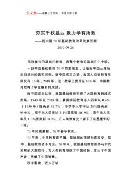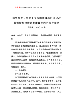 公文堂——海量公文资料,关注立即下载国务院办公厅关于支持国家级新区深化改革创新加快推动高质量发展的指导意见国办发〔2019〕58号各省、自治区、直辖市人民政府,国务院各部委、各直属机构:国家级新区(以下简称新区)是承担国家重大发展和改革开放战略任务的综合功能平台。自上世纪90年代以来,新区建设发展取得了显著成效,但也不同程度地面临规划建设不够集约节约、主导产业优势不够突出、管理体制机制不够健全、改革创新和全方位开放不够深化等问题。为促进新区加大创新创业力度,加强改革系统集成,扩大高水平开放,打造实体经济发展高地,引领高质量发展,经国务院同意,现提出以下意见。一、总体要求(一)指导思想。以习近平...