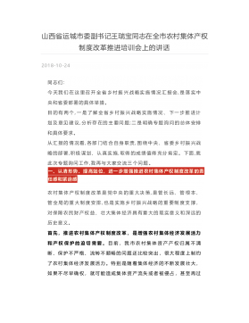 山西省运城市委副书记王瑞宝同志在全市农村集体产权制度改革推进培训会上的讲话2018-10-24同志们:今天我们在这里召开全省乡村振兴战略实施情况汇报会,是落实中央和省委部署的具体举措。目的有两个,一是了解全省乡村振兴战略实施情况、下一步推进计划及意见建议,分析存在的主要问题;二是明确专题询问的总体安排和具体要求。从汇报的情况看,各部门结合自身职责,围绕中央、省委乡村振兴战略的部署,积极谋划、认真实施,取得的成绩值得充分肯定。下面,就此次专题询问工作,我再与大家交流三个问题。一、认清形势、提高站位,进一步增强推进农村集体产权制度改革的责任感和紧迫感农村集体产权制度改革是党中央的重大决策,是管长远...