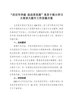 “庆百年华诞促改革发展”党员干部大学习大培训大提升工作实施方案为庆祝中国共产党成立100周年,深入学习贯彻习近平新时代中国特色社会主义思想和党的十九届五中全会精神,持续巩固深化“不忘初心、牢记使命”主题教育成果,现就开展“庆百年华诞促改革发展”党员大学习大培训大提升工作,制定如下实施方案。一、总体要求根据中央和省、市党员教育培训工作规划计划要求,结合巩固深化“不忘初心、牢记使命”主题教育成果,聚焦重温党的光辉历程,聚焦学习贯彻习近平新时代中国特色社会主义思想和党的十九届五中全会精神以及省委十一届十二次全会、市委X届X次全会精神,聚焦传承弘扬沂蒙精神,通过开展以“庆百年华诞促改革发展”为主题的党...