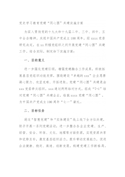 党史学习教育党建“同心圆”共建实施方案为深入贯彻党的十九大和十九届二中、三中、四中、五中全会精神,庆祝中国共产党成立100周年,经xxxx党委研究决定,在xx所辖党组织之间开展党建“同心圆”共建工作。结合实际,制定如下实施方案:一、目的意义进一步强化党建引领,增强党建融合工作成果,积极拓展基层党组织功能发挥,围绕建设“卓越的xxx”企业愿景凝心聚力、攻坚克难、开拓进取。党建“同心圆”共建是由xxx党委牵头组织,xxx通过两两结对方式,组成“7+1”结对党建“同心圆”共建企业,绘就xxxx党建“同心圆”,为中国共产党成立100周年“七一”献礼。二、目标任务通过“智慧党建”和“实体建设”线上线下全...
