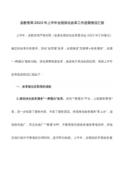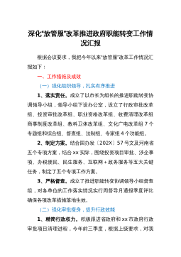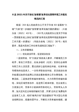X县2021年关于深化“放管服”改革优化营商环境工作落实情况的汇报根据《XX省人民政府办公厅关于印发XX省服务“六稳”“六保”进一步做好“放管服”改革实施方案的通知》(X政办发〔2021〕43号)、《XX市人民政府办公室关于印发<贯彻落实省上深化“放管服”改革优化营商环境提质提标年工作方案>的通知》(市政办发电〔2021〕30号)相关要求,我县对具体工作任务完成情况汇报如下:一、工作开展情况(一)优化就业环境,促进就业创业一是按照省、市“大就业”系统录入要求,不断规范工作程序,靠实工作责任,在各乡镇村(社区)安排社会保障专职工作人员负责,重点抓好公益性岗位补贴、社保补贴等模块的信息录入,一次性...
