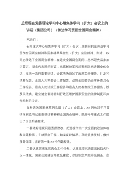 总经理在党委理论学习中心组集体学习(扩大)会议上的讲话(集团公司)(传达学习贯彻全国两会精神)同志们:召开这次中心组集体学习(扩大)会议,主要目的是传达学习贯彻全国两会精神和国家林草局党组(扩大)会议精神。刚才,xx同志传达了全国两会精神,在这次全国两会期间,总书记先后参加内蒙古、湖北代表团的审议,出席解放军和武警部队代表团全体会议,发表一系列重要讲话。会议表决通过了政府工作报告、计划和预算报告、全国人大常委会工作报告、政协全国委员会常务委员会工作报告、最高人民法院工作报告和最高人民检察院工作报告,以及民法典、建立健全香港特别行政区维护国家安全的法律制度和执行机制的决定。在昨天的国家林草局党组...