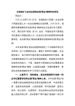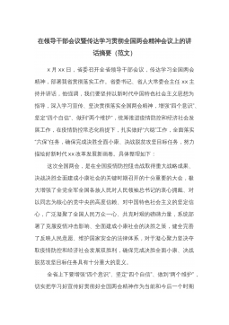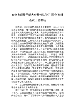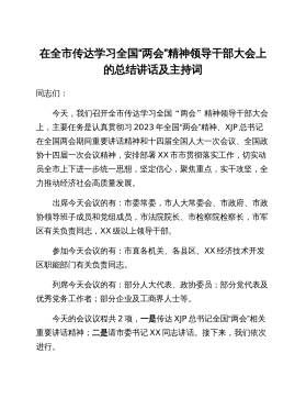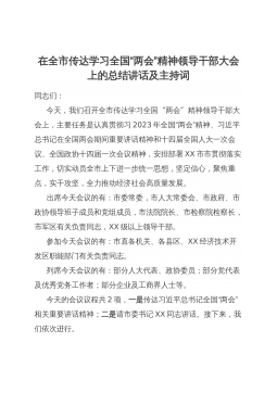 在全市传达学习全国“两会”精神领导干部大会上的总结讲话及主持词同志们:今天,我们召开全市传达学习全国“两会”精神领导干部大会上,主要任务是认真贯彻习2023年全国“两会”精神、习近平总书记在全国两会期间重要讲话精神和十四届全国人大一次会议、全国政协十四届一次会议精神,安排部署XX市市贯彻落实工作,切实动员全市上下进一步统一思想,坚定信心,聚焦重点,实干攻坚,全力推动经济社会高质量发展。出席今天会议的有:市委常委,市人大常委会、市政府、市政协领导班子成员和党组成员,市法院院长、市检察院检察长,市军区有关负责同志,XX级以上领导干部。参加今天会议的有:市直各机关、各县区、XX经济技术开发区职能部门...