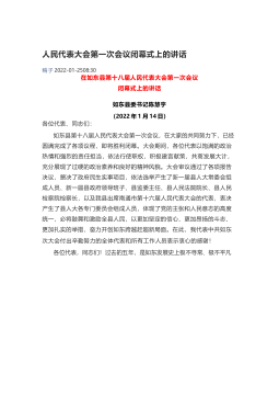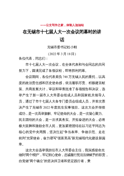 ——公文写作之家,体制人加油站在无锡市十七届人大一次会议闭幕时的讲话无锡市委书记杜小刚(2022年3月18日)各位代表,同志们:市十七届人大一次会议,在全体代表和与会同志的共同努力下,圆满完成了各项议程,即将胜利闭幕。会议期间,各位代表肩负748万无锡人民的重托,以高度的政治责任感和历史使命感,依法履职尽责、积极建言献策、共商发展大计,审议和审查批准了各项报告和决议,选举产生了新一届市人大常委会组成人员和国家机关领导人员,通过了市十七届人大各专门委员会组成人员,并首次票决产生了无锡市2022年度民生实事项目。这次大会开得很成功,是一次高举旗帜、牢记使命的大会,是一次凝心聚力、民主团结的大会,是...