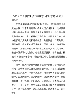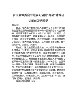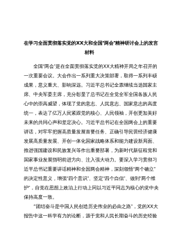 在学习全面贯彻落实党的XX大和全国“两会”精神研讨会上的发言材料全国“两会”是在全面贯彻落实党的XX大精神开局之年召开的一次重要会议。大会作出一系列重大决策部署,取得一系列丰硕成果,意义重大、影响深远。习近平总书记全票继续当选国家主席、中央军委主席,充分彰显了总书记在全党全军全国各族人民心中的崇高威望,体现了党的意志、人民意志、国家意志的高度统一,表达了亿万人民紧跟党的核心、人民领袖,开创更加美好未来的共同心声和坚定决心。习近平总书记在全国两会上的重要讲话,对牢牢把握高质量发展首要任务、正确引导民营经济健康发展高质量发展、开创一体化国家战略体系和能力建设新局面、推进强国建设和民族复兴等作出重要...