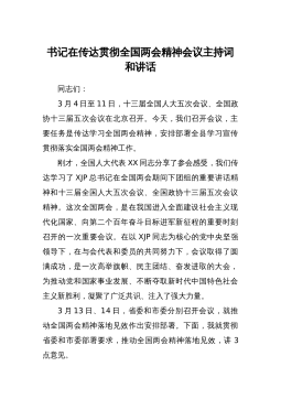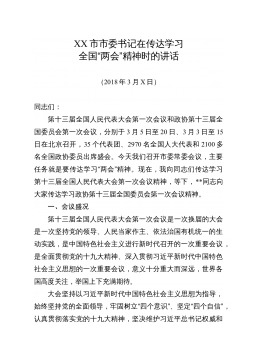 XX市市委书记在传达学习全国“两会”精神时的讲话(2018年3月X日)同志们:第十三届全国人民代表大会第一次会议和政协第十三届全国委员会第一次会议,分别于3月5日至20日、3月3日至15日在北京召开,35个代表团、2970名全国人大代表和2100多名全国政协委员出席盛会。今天我们召开市委常委会议,主要任务就是要传达学习“两会”精神。现在,我向同志们传达学习第十三届全国人民代表大会第一次会议精神,等下,**同志向大家传达学习政协第十三届全国委员会第一次会议精神。一、会议盛况第十三届全国人民代表大会第一次会议是一次换届的大会是一次坚持党的领导、人民当家作主、依法治国有机统一的生动实践,是中国特色社...