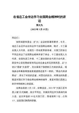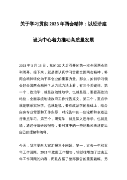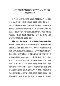 2023全国两会会议精神学习心得体会发言材料13月5日,XJP总书记在参加十四届全国人大一次会议江苏代表团审议时强调,高质量发展是全面建设社会主义现代化国家的首要任务。新征程赋予新使命,新使命呼唤新作为。党员干部要深刻领会贯彻XJP总书记讲话精神,树立“实干”的“风向标”,锚定“为民”的“坐标系”,扬起“创新”的“劲风帆”,争当高质量发展的引领者、开拓者、推动者,以奋斗姿态谱写髙质量发展新篇章。树立“实干”的“风向标”,在“不待扬鞭自奋蹄”中激昂奋斗精神。高质量发展是“方方面面的总要求”,在通往新征程的道路上,没有捷径,唯有实干。2022年我国国内生产总值增长3%,城镇新增就业1206万人,年...