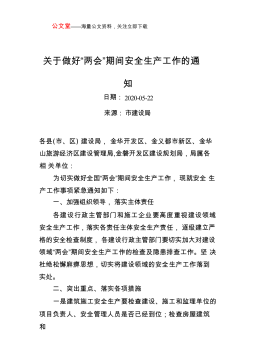 公文堂——海量公文资料,关注立即下载关于做好“两会”期间安全生产工作的通知日期:2020-05-22来源:市建设局各县(市、区)建设局,金华开发区、金义都市新区、金华山旅游经济区建设管理局,金磐开发区建设规划局,局属各相关单位:为切实做好全国“两会”期间安全生产工作,现就安全生产工作事项紧急通知如下:一、加强组织领导,落实主体责任各建设行政主管部门和施工企业要高度重视建设领域安全生产工作,落实各责任主体安全生产责任,逐级建立严格的安全检查制度,各建设行政主管部门要切实加大对建设领域“两会”期间安全生产工作的检查及隐患排查工作。坚决杜绝松懈麻痹思想,切实将建设领域的安全生产工作落到实处。二、突出...