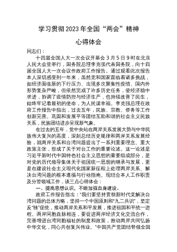 2023年两会精神学习体会及发言共四篇第一篇春风有信,柳色又新,中国走进了一年一度的两会时间。“依法治国,从严治党,社会保障……"每当进入两会时间,总会诞生一批批“两会热词”,它们或出自于代表委员的金句,或来自拟提交的提案议案,又或是某位专家的权威解读。一个个“热词”,记录了民之所望,勾勒着奋进坐标,标注出幸福刻度,寄托着人们对美好未来的无限憧憬,更传递出积极进取奋发有为的家国之声。看两会,读“热词”,让我们一起在“热词”中感悟那份暖心温度、从严力度、强劲速度,为奋进中国汇聚更多强大力量。读“两会热词”感悟“人民至上”暖人心脾的“民生温度”。”为政之道,以顺民心为本,以厚民生为本。”人们之所以...