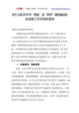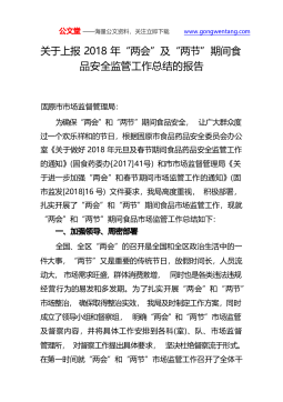 ——海量公文资料,关注立即下载www.gongwentang.com关于上报2018年“两会”及“两节”期间食品安全监管工作总结的报告固原市市场监督管理局:为确保“两会”和“两节”期间食品安全,让广大群众度过一个欢乐祥和的节日,根据固原市食品药品安全委员会办公室《关于做好2018年元旦及春节期间食品药品安全监管工作的通知》(固食药委办[2017]41号)和市市场监督管理局《关于进一步加强“两会”和春节期间市场监管工作的通知》(固市监发[2018]16号)文件要求,我局高度重视,积极部署,扎实开展了“两会”和“两节”期间食品市场监管工作,现就“两会”和“两节”期间食品市场监管工作总结如下:全国、...