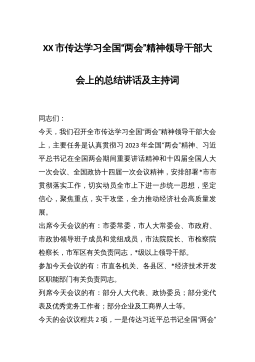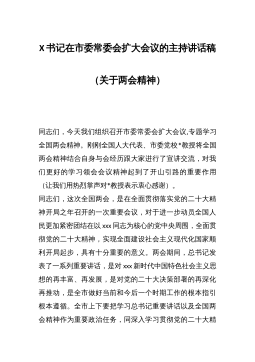 X书记在市委常委会扩大会议的主持讲话稿(关于两会精神)同志们,今天我们组织召开市委常委会扩大会议,专题学习全国两会精神。刚刚全国人大代表、市委党校*教授将全国两会精神结合自身与会经历跟大家进行了宣讲交流,对我们更好的学习领会会议精神起到了开山引路的重要作用(让我们用热烈掌声对*教授表示衷心感谢)。同志们,这次全国两会,是在全面贯彻落实党的二十大精神开局之年召开的一次重要会议,对于进一步动员全国人民更加紧密团结在以xxx同志为核心的党中央周围,全面贯彻党的二十大精神,实现全面建设社会主义现代化国家顺利开局起步,具有十分重要的意义。两会期间,总书记发表了一系列重要讲话,是对xxx新时代中国特色社会...