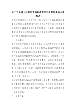 关于开展树立和践行正确政绩观学习教育的实施方案(精品)为深入贯彻习近平总书记关于树立和践行正确政绩观的重要论述精神,认真落实《中共中央办公厅关于在全党开展树立和践行正确政绩观学习教育的通知》和省委、市委部署要求,扎实推进本单位树立和践行正确政绩观学习教育各项工作,结合实际,制定本方案。一、总体要求坚持以习近平新时代中国特色社会主义思想为指导,全面贯彻党的二十大和二十届历次全会精神,认真落实党的二十届四中全会战略部署,深入学习贯彻习近平总书记关于树立和践行正确政绩观的重要论述,以"立党为公、为民造福、科学决策、真抓实干"为总要求,坚持学查改一体推进,聚焦深学、真查、实改,教育引导全体党员干部坚持实事求是、求真务实,为人民出政绩、以实干出政绩,有效防范和纠治政绩观偏差,创造经得起实践、人民、历史...